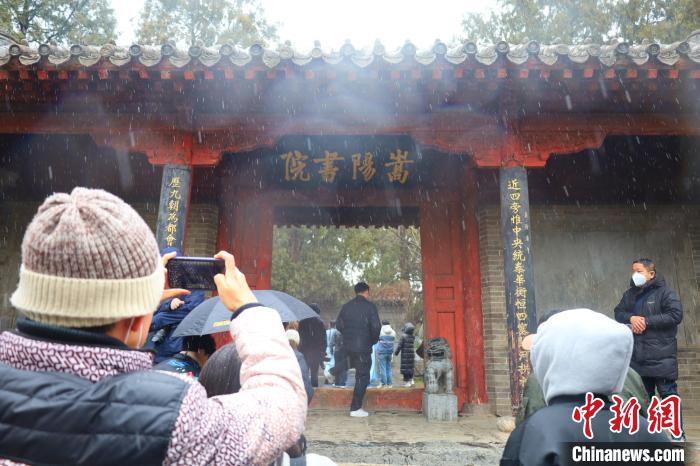 中新網(wǎng)鄭州2月23日電 (王迪)春雪依依,古柏森森,紅墻青瓦間傳出幾句儒家經(jīng)典的吟誦之聲……在22日的“寫意中國——探訪漢字起源”主題宣傳采訪中,記者探訪了河南登封市區(qū)北約二公里處嵩山南麓的嵩陽書院。是日清晨,登封忽降細雪,映襯得整個嵩陽書院愈發(fā)肅穆。美景難得,引得游人紛紛駐足欣賞,拍照留念。