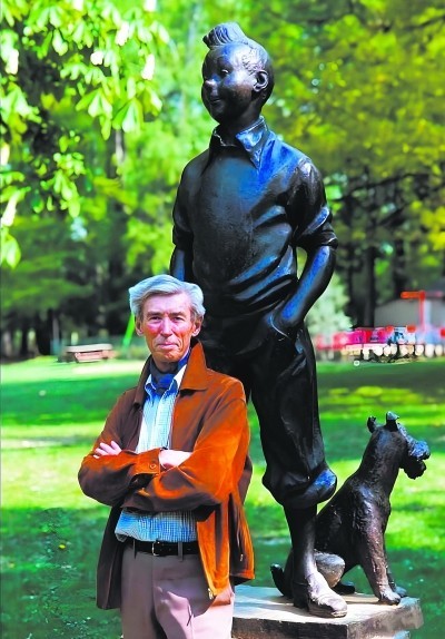 作者埃爾熱與丁丁雕像合影