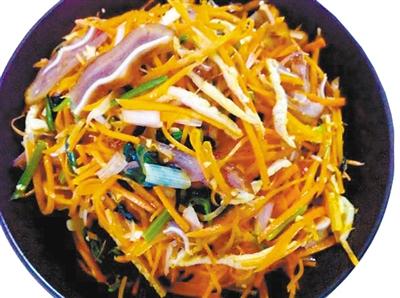 ● 做法:以地產(chǎn)蔬菜胡蘿卜、菠菜和綠豆芽,搭配耳絲、口條、肝片而成,色澤明快、微酸適口:胡蘿卜絲用少許鹽腌至脆柔、綠豆芽焯水保持白嫩、綠菠菜焯過捏去水分切成寸段,這三樣食材搭配營養(yǎng)成分暫且不說,單就紅、白、綠三色,就足夠醒目了。正宗的天水酒碟還要配以鹵豬耳、豬肝和煮熟的拆骨肉,最后點(diǎn)綴以綠綠的香草。