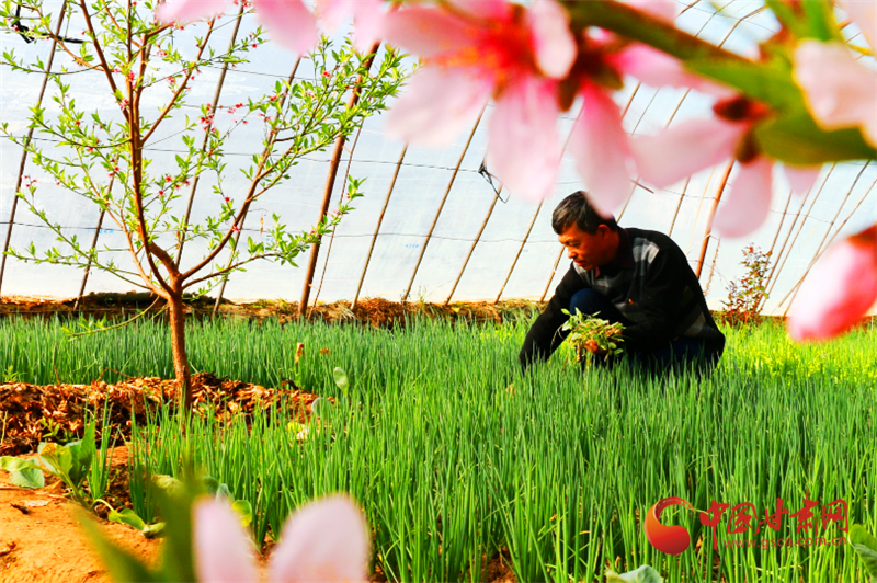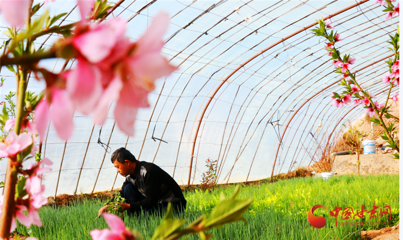 走進(jìn)敦煌市月牙泉鎮(zhèn)現(xiàn)代采摘園區(qū)農(nóng)民陶寶憲的溫室大棚,粉紅的桃花開得正艷,濃濃春意撲面而來(lái),在花香的陪伴下,陶寶憲在大棚中辛勤勞作。