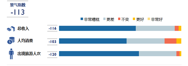 《報告》指出,受疫情影響,從業(yè)者對2020年上半年出境旅游市場的整體業(yè)績預期極為悲觀。與去年同期相比,景氣指數(shù)大跌113個指數(shù)點,至-113。同時,出境旅游人次、人均消費及總收入三項指標的市場預期較2019年上半年均有大幅下滑,其中受疫情于全球蔓延的影響,從業(yè)者對出境旅游人次的預期負面性最高。