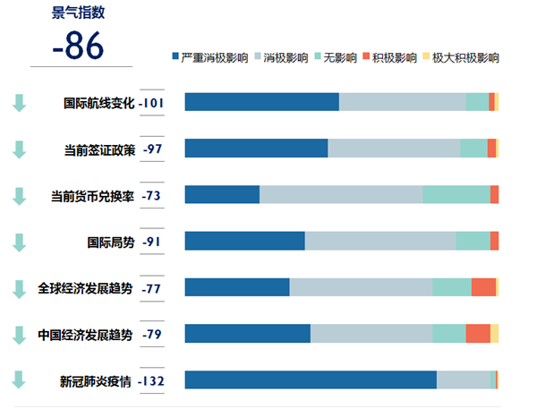 整體而言,從業(yè)者預期以上7項因素均將對2020年上半年出境旅游市場業(yè)績產(chǎn)生負面影響,導致整體景氣指數(shù)下降至-86。其中,正于全球蔓延的新冠疫情被認為是限制出境旅游市場發(fā)展的最主要因素。