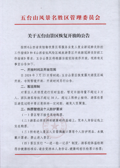 五臺(tái)山風(fēng)景名勝區(qū)管理委員會(huì)對(duì)外宣布,自2020年3月25日零時(shí)起,山西五臺(tái)山風(fēng)景名勝區(qū)恢復(fù)露天游覽區(qū)域開放寺院暫緩開放,開放時(shí)間另行公告。