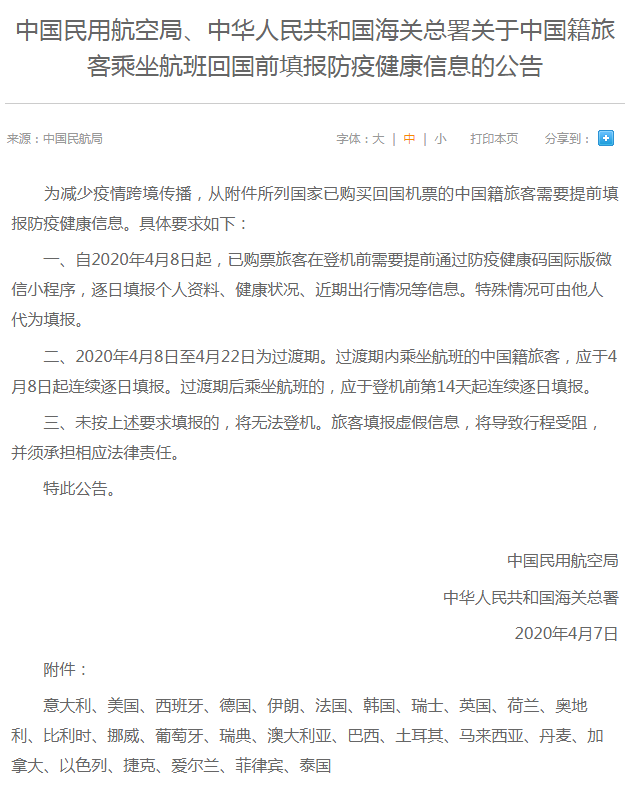 中國民用航空局、中華人民共和國海關總署4月7日聯(lián)合發(fā)布《關于中國籍旅客乘坐航班回國前填報防疫健康信息的公告》(以下簡稱《公告》)。《公告》指出,自4月8日起,從意大利、美國、西班牙等26個國家已購買回國機票的中國籍旅客需要在登機前提前填報防疫健康信息,包括逐日填報個人資料、健康狀況、近期出行情況等。旅客未按要求填報的,將無法登機;填報虛假信息,將導致行程受阻,并須承擔相應法律責任。