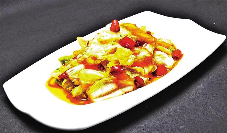 酸辣白菜的食材要選上等的大白菜,剝?nèi)ネ鈱永先~當(dāng)主料。老姜去皮,優(yōu)質(zhì)紅朝天椒泡軟,川椒過熱水,以白糖、米醋、味精、香油等為輔料。先把白菜切細(xì)條,放入微量鹽,拌勻腌制四五個小時后,在涼開水中過一下,撈出控水,放至微蔫。這時,起炒鍋開火,冷油放入辣椒、花椒、蔥絲、姜絲,慢慢煎至微微發(fā)黃散出香味時,將油潑在白菜上,最后放入白糖、米醋、味精等拌勻,就大功告成了。