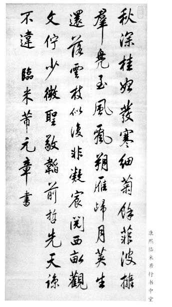 《張掖文物》中有一幅《康熙臨米芾行書中堂》。這幅作品為紙本,縱230厘米,橫77厘米,共計(jì)5行,縱橫飄逸,平淡古樸,為康熙臨寫米芾的大字行書。