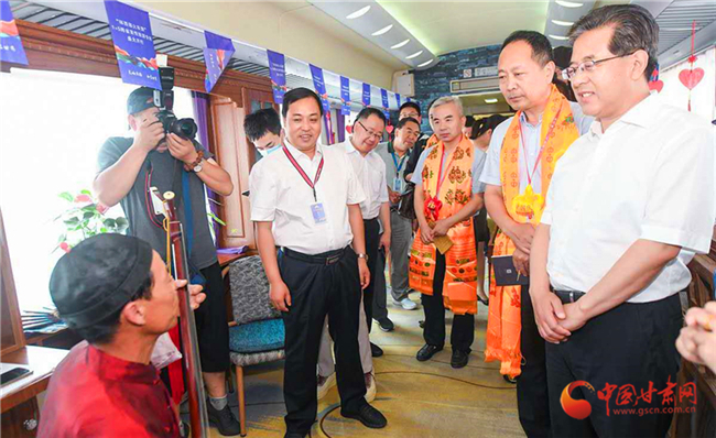 專列到達(dá)西安南站后,陜西省文旅廳及文旅相關(guān)部門對(duì)“環(huán)西部火車游”專列的到來表示熱烈的歡迎,陜西省文旅廳負(fù)責(zé)人在甘肅省委宣傳部副部長(zhǎng)、省文旅廳黨組書記、廳長(zhǎng)陳衛(wèi)中和武威市文體廣電和旅游局負(fù)責(zé)人的陪同下參觀了“環(huán)西部火車游”武威館,并欣賞了國(guó)家級(jí)非遺項(xiàng)目“涼州賢孝”表演。