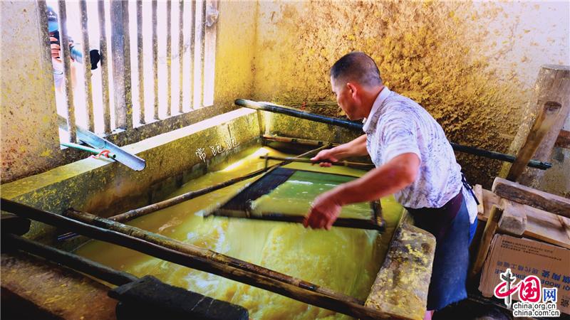 隆回縣灘頭鎮(zhèn)桃林村手工抄紙作坊,已經(jīng)成為一處著名的文旅項(xiàng)目景點(diǎn)。走進(jìn)陶林村,一棟棟青瓦石墻的新屋吸引了人們的目光。屋外山坡竹林茂密,山溪流水潺潺,屋內(nèi)手工抄紙制作的原料、工具布置的次序井然,手工抄紙的全套工藝流程在這幾棟屋中得以完整體現(xiàn)。手工抄紙技術(shù)歷史悠久,始于隋唐,至明朝時(shí)抄紙已經(jīng)非常盛行。上世紀(jì)八十年代鼎盛時(shí)還曾遠(yuǎn)銷東南亞和日本。非遺傳承人李志軍今年61歲,自稱“紙蟲”,帶領(lǐng)著全家人承襲著祖宗留下的獨(dú)特技藝。而支撐著李志軍的堅(jiān)守的,是隆回縣文旅部門的巨大付出和努力。2011年,他們支持李志軍建立了手工抄紙標(biāo)準(zhǔn)化作坊,2016年又對(duì)該作坊進(jìn)行擴(kuò)建,使之成為國(guó)家級(jí)非遺項(xiàng)目。灘頭手工抄紙作坊占地面積1714平方米,是灘頭手工抄紙有史以來(lái)最大的作坊,同時(shí)也是集生產(chǎn)、創(chuàng)新、傳承、展示、研學(xué)為一體的重要基地和文旅基地。