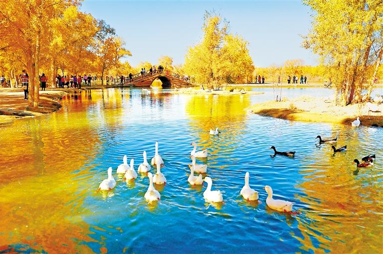 站在金波湖邊,滿目的赤橙黃綠與盈盈秋水互相映襯,胡楊金色的葉子倒映在潭水中,形成金色的水泊,微風(fēng)掠過(guò),層層漣漪漸漸擴(kuò)大,最后消失在胡楊的倩影里,構(gòu)成一幅幅精美的油畫。烘托出一幅“碧云天、黃葉地、秋色連波、波上寒煙翠”的絕美妙油畫卷。