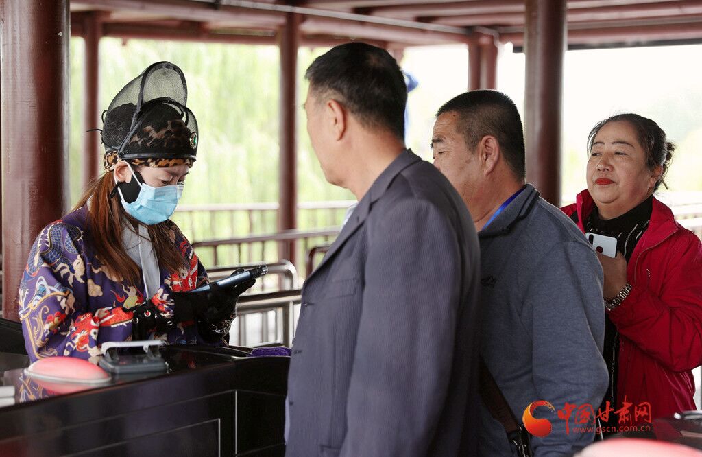 9月22日,記者在嘉峪關(guān)關(guān)城看到前來參觀的游客絡(luò)繹不絕,大家跟隨漢服飄逸的講解員沿著關(guān)城前行。在甕城感受“甕中捉鱉”的境遇,在關(guān)口倒換通關(guān)文牒尋求關(guān)照。一路上都能遇到穿著明朝服飾的工作人員,將人們帶入大明風(fēng)華的場(chǎng)景之中。
