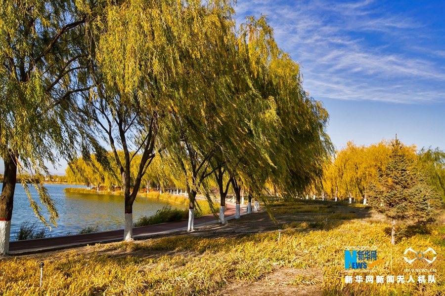 深秋時(shí)節(jié),國(guó)家4A級(jí)景區(qū)甘肅省張掖潤(rùn)泉湖公園秋水依依,草木金黃,呈現(xiàn)出一幅斑斕畫卷。新華網(wǎng)發(fā)(成林 攝)
