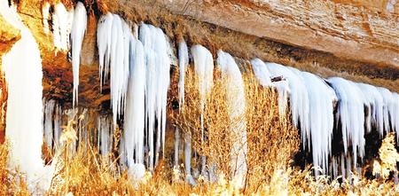 小路隨著山勢(shì),曲折延伸。對(duì)面荒坡上隨處可見(jiàn)大大小小的洞穴,不知是經(jīng)年風(fēng)蝕,還是人工開(kāi)采沙子所致。洞穴四周,散落著小小的冰瀑,有的似乎只有盈盈一握。長(zhǎng)長(zhǎng)短短的冰掛,一綹一綹,一排一排,遠(yuǎn)遠(yuǎn)近近錯(cuò)落有致地覆在山坳里,垂在砂石間,掛在懸崖上。一些細(xì)細(xì)長(zhǎng)長(zhǎng)的冰溜,像極了臘月里母親剛出鍋的粉條。搭在院子竹竿上的一掛粉條,下邊還垂著水珠,上邊早已凍成了細(xì)細(xì)的冰棒,而滴落在地上的水已凝成了冰堆。