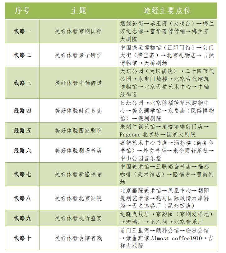 本次精心設(shè)計(jì)推出的10條“漫步北京-美好體驗(yàn)藝術(shù)之旅主題游”線路覆蓋了十三藝節(jié)北京各主要展演場(chǎng)館,結(jié)合場(chǎng)館特點(diǎn)和周邊文旅資源,以展演場(chǎng)館為核心,以慢行交通系統(tǒng)為紐帶,以文化場(chǎng)所、旅游景點(diǎn)、網(wǎng)紅打卡地為節(jié)點(diǎn),主題鮮明、規(guī)劃合理,帶領(lǐng)市民游客觀演出、看展覽、賞風(fēng)景、品美食,共享“藝術(shù)的盛會(huì)、人民的節(jié)日”。