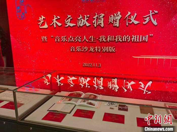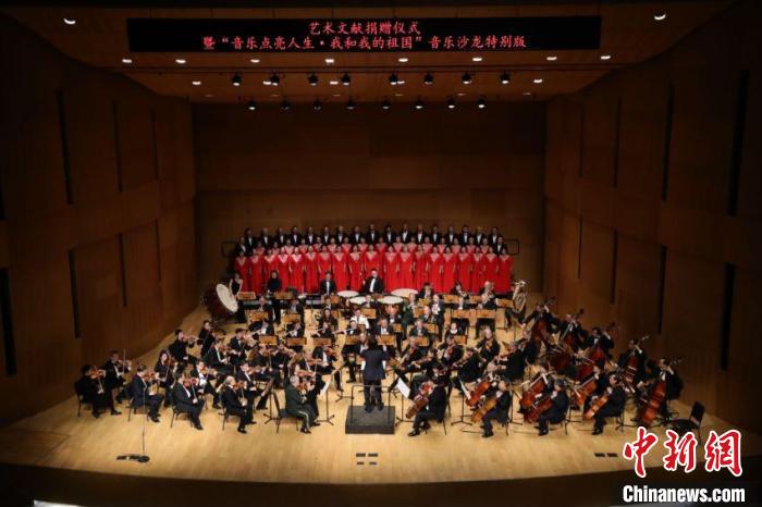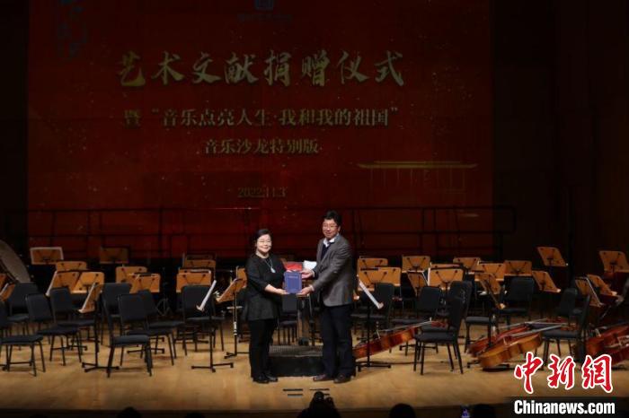 國家圖書館重要藝術文獻捐贈儀式暨“音樂點亮人生·我和我的祖國——音樂沙龍?zhí)貏e版”活動3日晚在國圖藝術中心·音樂廳舉辦。國家圖書館黨委書記、副館長魏大威接受捐贈,并為捐贈人代表中央民族歌舞團民樂團團長馬蘭花頒發(fā)捐贈證書。