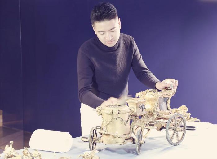 “這件‘魔術(shù)人鐘’功能比較復(fù)雜,經(jīng)過(guò)長(zhǎng)期開動(dòng)后,出現(xiàn)了一點(diǎn)故障,就存放在了庫(kù)房。”亓昊楠說(shuō),自己和師父王津一起修復(fù)這座鐘表時(shí),才發(fā)現(xiàn)它的內(nèi)部系統(tǒng)有多精細(xì)。