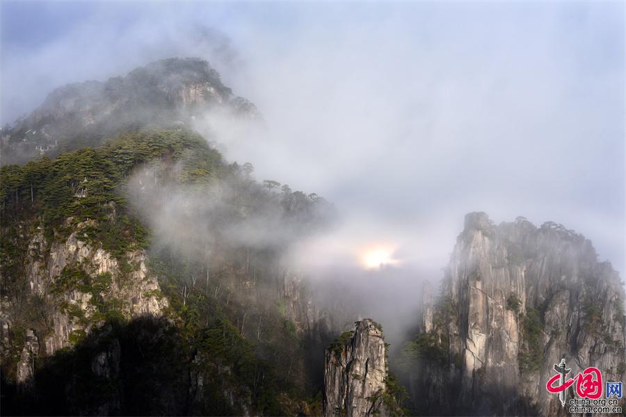 在黃山風景區(qū)的始信峰,群峰中時而云海翻騰,時而霧靄朦朧,時而艷陽高照,還出現了佛光奇觀,勾勒出一幅幅黃山獨有的勝景。
