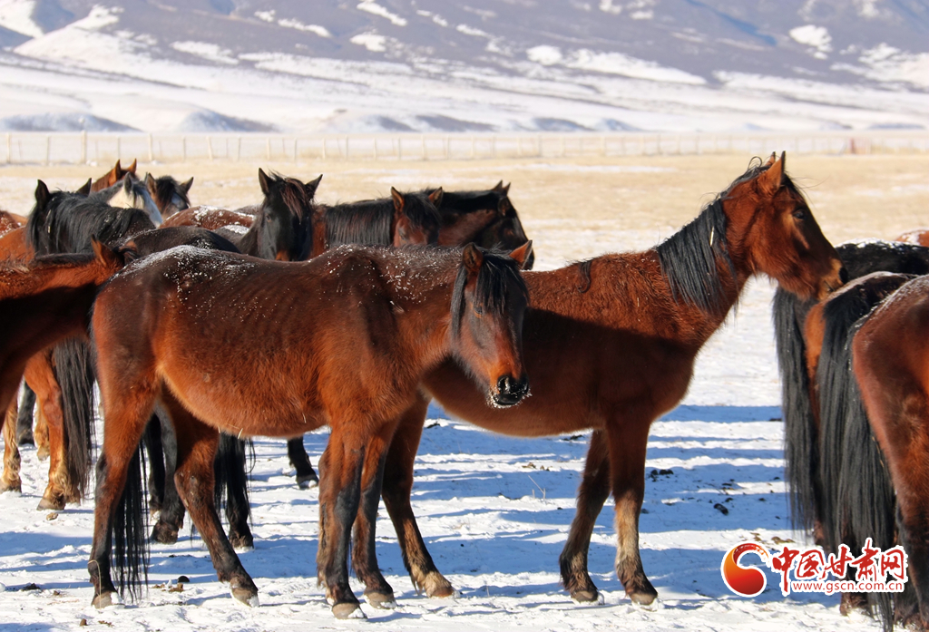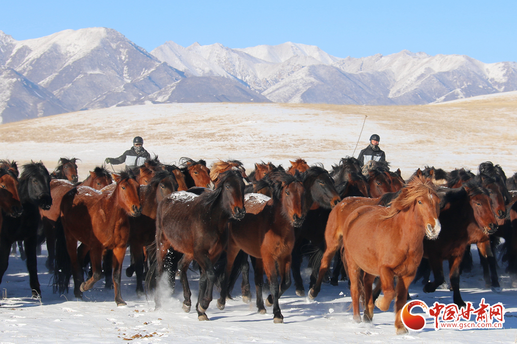 2月9日,在甘肅山丹馬場,上演了萬馬奔騰的壯觀景象,健壯的馬蹄濺起陣陣飛雪,實屬震撼。