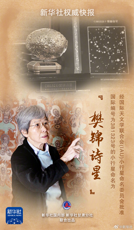 7月10日,樊錦詩從事敦煌文物工作60年座談會(huì)在敦煌舉行。會(huì)上正式命名了編號381323小行星為#樊錦詩星#。繼向北京大學(xué)捐資1000萬元支持敦煌學(xué)研究后,樊錦詩再向中國敦煌石窟保護(hù)研究基金會(huì)捐資1000萬元,用于敦煌文物事業(yè)發(fā)展和急需人才培養(yǎng)。捐款來自樊錦詩所獲獎(jiǎng)金及個(gè)人積蓄。(記者:張玉潔 施雨岑 張智敏)