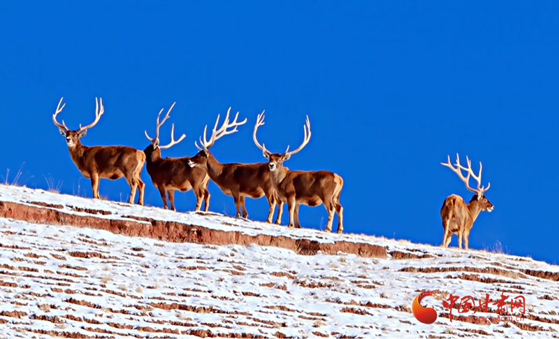 畫(huà)面顯示,在白雪皚皚的祁連山之上,五只白唇鹿駐足停留,仿佛也在欣賞祁連山美景,這些白唇鹿體態(tài)壯碩、動(dòng)作靈活,在鹿群“首領(lǐng)”的帶領(lǐng)下越過(guò)山坡,前往下一個(gè)覓食地。
