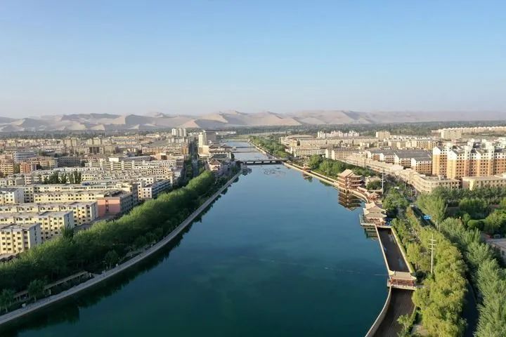 乘飛機從甘肅省會蘭州往西飛行約兩個小時后,茫茫戈壁上一個綠色小點出現在視線里。隨著飛機高度下降,俯瞰下去,一片多邊形的綠洲逐漸顯現,如一塊美麗寶石。