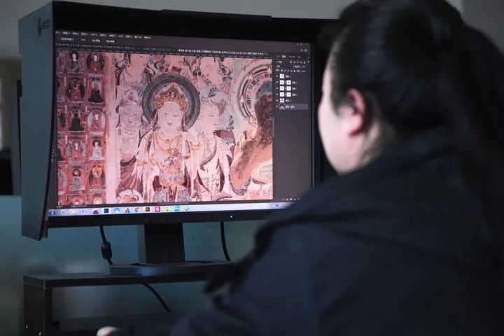 2023年4月25日,敦煌研究院文物數字化保護團隊圖像處理人員年海麗在拼接壁畫圖像。新華社記者 陳斌 攝