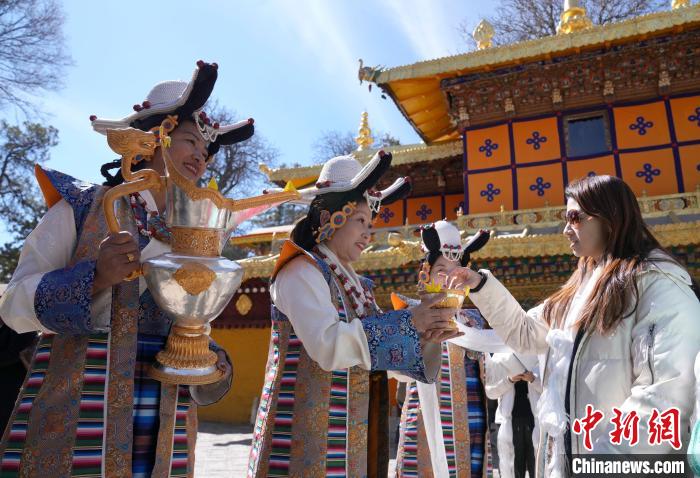 圖為歡迎儀式現(xiàn)場,工作人員向香港游客敬獻青稞酒。中新社記者 李林 攝