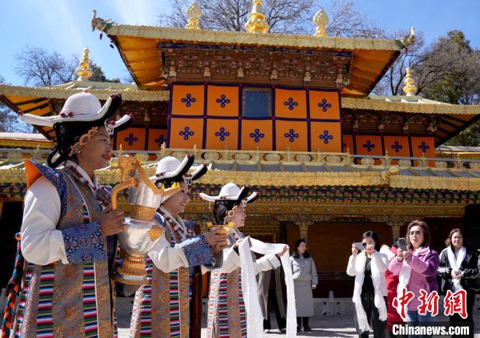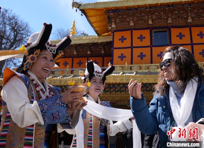2月20日,由西藏自治區(qū)文化和旅游廳舉辦的2025年香港至拉薩航班首航旅行團歡迎儀式在羅布林卡舉行。來自香港的游客將前往布達拉宮、大昭寺等地,開啟冬游西藏旅途。2月19日,拉薩至香港的首條地區(qū)航線正式開通。航線的開通,更加便捷了兩地居民的出行,也將進一步促進兩地在旅游、文化、經(jīng)貿(mào)等領域的交流與合作。圖為歡迎儀式現(xiàn)場,工作人員向香港游客敬獻青稞酒。中新社記者 李林 攝
