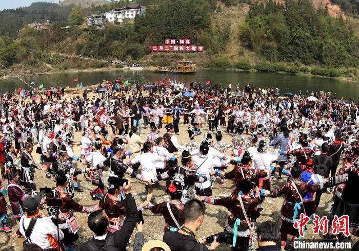 2024年3月11日,在廣西三江侗族自治縣梅林鄉(xiāng),“二月二”侗族大歌節(jié)活動吸引游客前來體驗侗鄉(xiāng)風(fēng)情。圖為民眾在跳多耶舞。 吳練勛 攝
