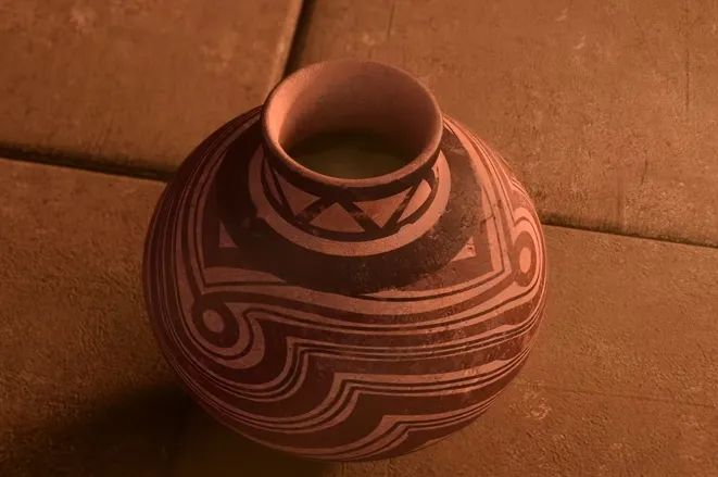 聚落西側(cè),陶窯青煙繚繞。匠人屈膝修整泥胎,赤鐵礦研成的褐彩順陶罐流瀉,旋渦紋隨轉(zhuǎn)盤飛旋延展。孩童赤足追逐,泥塑鳥獸滾落草間,驚散啄食的雞雛。