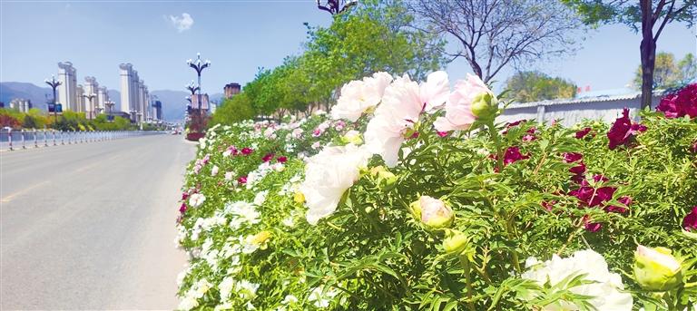 道路旁牡丹花爭(zhēng)相開放