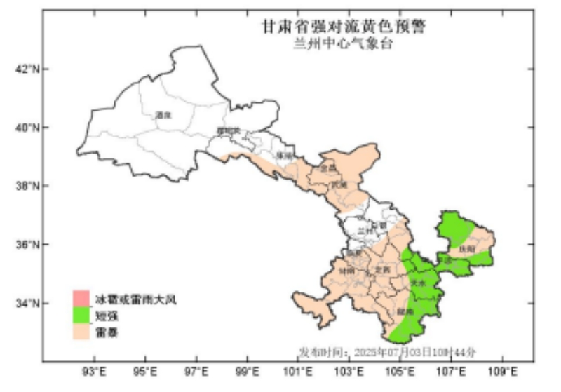 蘭州中心氣象臺2025年7月3日10時44分繼續(xù)發(fā)布強對流黃色預警:預計未來24小時,張掖、金昌、武威、蘭州、白銀、甘南、臨夏、定西、隴南、天水、平?jīng)?、慶陽等州市有雷暴,其中隴南、天水、平?jīng)?、慶陽等市部分地方及白銀、定西兩市局部地方有短時強降水,最大小時雨強20-60mm;隴南、天水、平?jīng)觥c陽等市強降水在未來24小時內(nèi)多發(fā),白銀、定西主要強降水時段在4日2-8時。請注意防范!