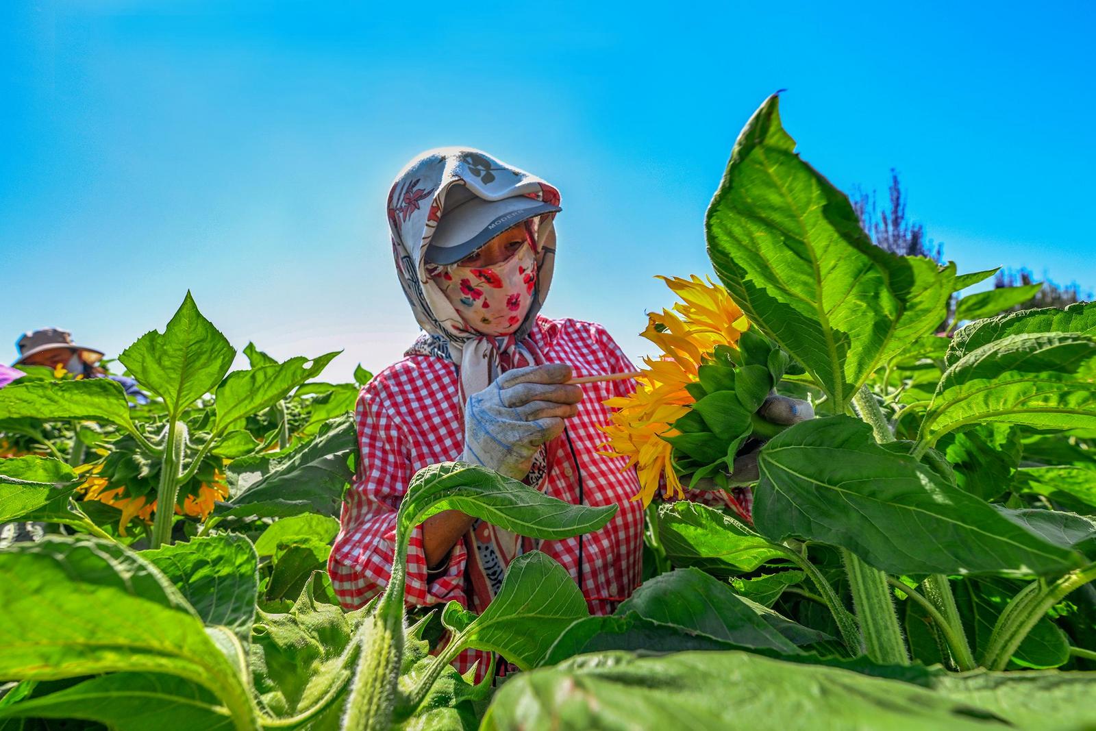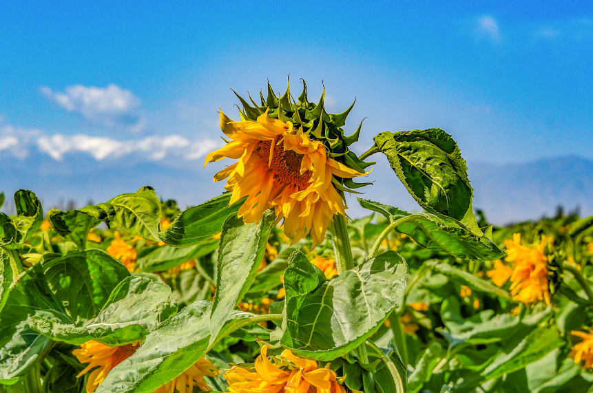 中國甘肅網(wǎng)7月14日訊 據(jù)嘉峪關(guān)日報(bào)報(bào)道(融媒體中心記者 李巍 攝)近日,嘉峪關(guān)市新城鎮(zhèn)野麻灣村“千畝”制種向日葵迎來盛花期,朵朵花盤匯聚成金色花海,放眼望去,與雪山相融、與藍(lán)天相接,如詩如畫,美不勝收。