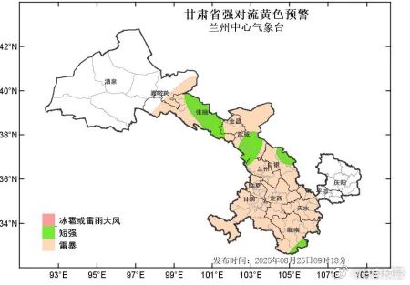 蘭州中心氣象臺2025年08月25日09時18分發(fā)布強對流黃色預警:預計未來24小時,河西五市、隴中、甘南高原、隴南、天水、平?jīng)鑫鞑坑欣妆渲?,張掖、武威南部?span style="font-weight: bolder;">蘭州北部、白銀東部、隴南南部有短時強降水,強降水主要時段在25日20時—26日06時,最大小時雨強河西20-40毫米,其余地方30-50毫米。請注意防范!